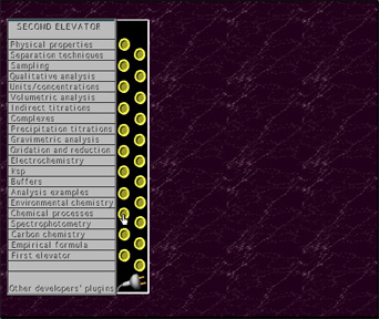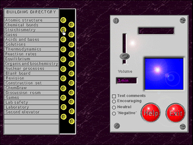 What is Polychem?Polychem is a comprehensive interactive multimedia chemistry tutorial and simulation tool that helps teachers and students by providing literally hundreds of hours of student activity. The software is not like those programs that provide a nice but short demonstration on a single topic. The full program occupies around 500mB, there are hundreds of screens. Polychem is normally only available as a site licence. The software contains literally dozens of topics, simulations, videos and activities at senior high school/ college level provided via download that is playable on both PC and Mac formats. The software has been developed over the past ten years and has been the subject of a number of research studies. These have enabled the software to develop, and determined the ways that it can be used to best advantage by students and teachers. What level is the program? Senior high school and college, with an emphasis on the applied nature of chemistry. Most high schools use it for year 12 as well as for some topics at year 11. There are more sections that extend the range of applicable levels. What benefits are there for a teacher?Students using this interactive multimedia chemistry program are on task for a longer time and are easier to help learn. There has been a more relaxing atmosphere in the class with more time to work on a one to one basis. There has also been less teacher involvement in marking, the students are able to reflect and learn from their own mistakes much more than in the past. This environment can be used a significant teaching tool, not just as a supplement. This means that there is not the stress of a normal classroom. Teachers with more time should be better teachers. What benefits are there for students?Research has shown that the students using this interactive multimedia chemistry approach are well motivated and enjoy using the software. They prefer the software to traditional types of instruction and have more have fun in chemistry. Students are empowered to take more responsibility for their own learning and can spend time learning, not just copying down notes. What response has there been?Feedback has been excellent. A common response from the schools is that the software is comparable in cost to a set of textbooks. They have said that the students are often asking to use the computers but usually never have asked to use textbooks. How long has it been in use?The software has been in use and constantly upgraded since 1993 and so has been given extensive student testing and development. The 2011 version includes many more chemistry games and 3D activities as well as full screen support. Who uses it?Insitutions use the software, in such diverse places as the United States, United Kingdom, South Africa, Australia and New Zealand. What is the general format?The program is a stand-alone application, you don't need to be connected to the Internet (although there is Internet capability). There are notes, computer generated interactive questions and exam questions. There are also many simulations of equipment and of chemical processes. There is also a section on organic chemistry that contains notes, interactive sections, simulations questions and nomenclature problems. There are chemistry based games, demonstrations and activities. A key feature is the provision of model answers for the computer generated questions to help student reflection and analysis. And we shouldn't forget the jokes... What topics does it cover?The first elevator shows year 12 topics, there also is a second elevator that includes more analytical and industrial applications. Some of the topics lead on to other sections that are not able to be shown. How can it be used in class teaching?A topic should be introduced in outline form at the beginning of a class. If an overhead projector is available then it should also be discussed while students follow the notes on their own computers. Students may edit the notes to suit themselves. Students then print the notes and continue for the remainder of the class undertaking the interactive questions, simulations or other activites. List these requirements on the board and just go round and help - it's teaching the way it should be! How easy is it for students to operate?Very easy, most students need no help. Even students who have limited computer experience are usually up and learning within minutes. No special computer installation or set-up is necessary. What input have students had on the program?This has been a development that puts students first. The format, features and use were determined by a action research project as part of a Masters' thesis. The software environment has been the subect of a number of papers in international journals. Chemistry in the past has sometimes not found favour with female students and their feedback has resulted in the software contributing to a non-threatening secure learning environment. Can the software be user modified?All the text notes on the whiteboard can be modified on screen, even over a network, and printed. They can be permanently modified in an unlocked version. The notes are relatively brief and to the point to prevent paper wastage. The text can be enlarged using the controls for use by the teacher on a classroom projector or to benefit students with visual impairment. Examination questions can be added and altered. A multiple choice template is included so that teachers can add their own questions or construct tests, the results can then be recorded or direct mailed. Facilities are included so that other developers can add topics and modules. What records can be kept?Provided the user has write privileges to a disk, then marks for most activities can be recorded along with names, dates and times. What type of computers are required?IBM compatible with Windows as well as Macintosh OSX. How does it play over a network?Although there can be no guarantees as individual networks will be set u